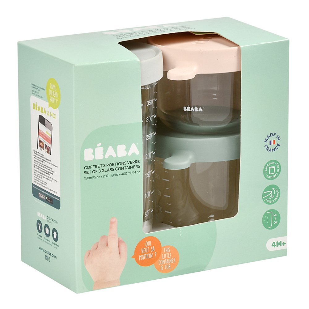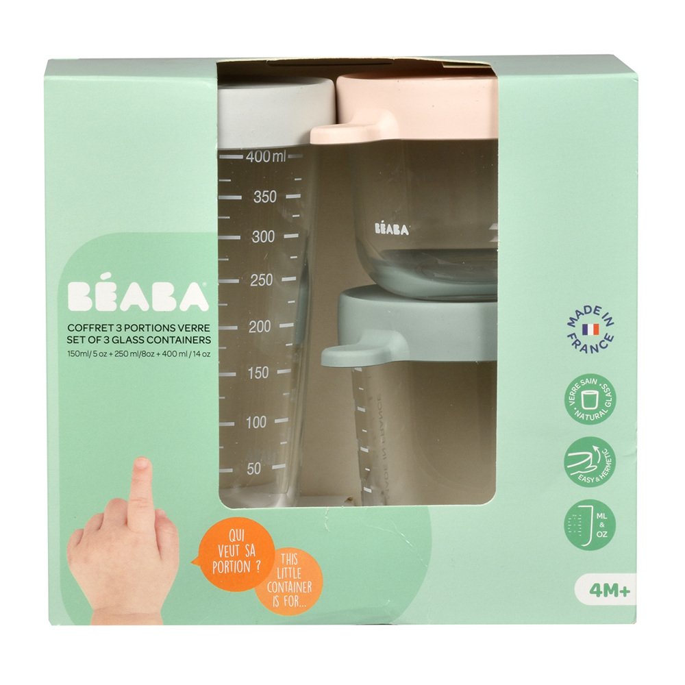 Набір Beaba складається з 3 контейнерів (150, 250 та 400 мл) з чіткою мірною шкалою, м’яких еластичних кришок, які легко надягаються та дозволяють герметично закрити контейнер.