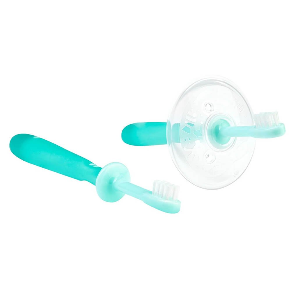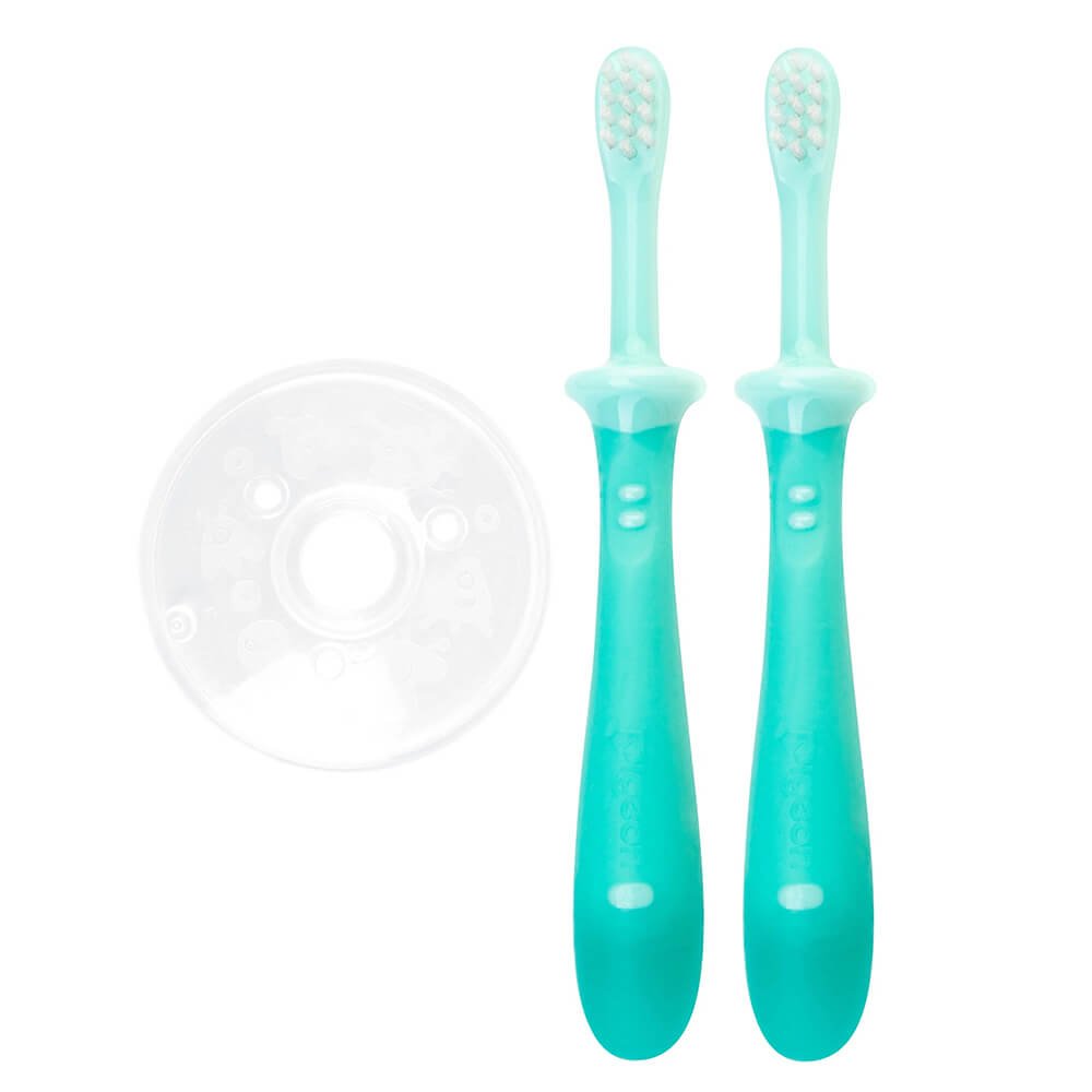 • У комплекті: У цьому наборі ви знайдете дві зубні щітки, призначені для різних вікових етапів розвитку дитини, та одне кільце-обмежувач для додаткової безпеки.