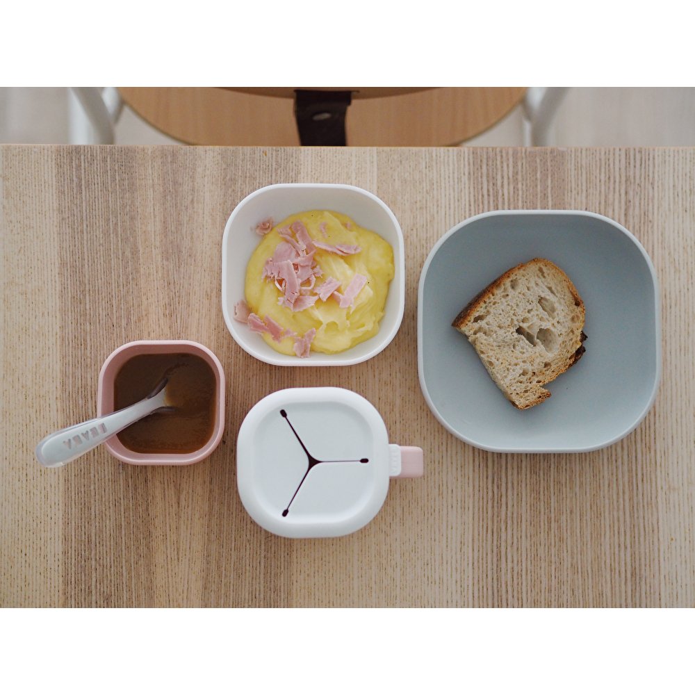 Всі предмети посуду виготовлені із високоякісного силікону, який не б’ється, не деформується та не містить шкідливих речовин. Силіконовий посуд підходить для використання в мікрохвильовій печі та морозильній камері, а також легко миється у посудомийній машині. Тарілки мають різну ємність та форму: це дозволяє подавати різні види їжі залежно від віку та апетиту дитини. Можна використовувати для малечі з 4 місяців і до старшого віку.