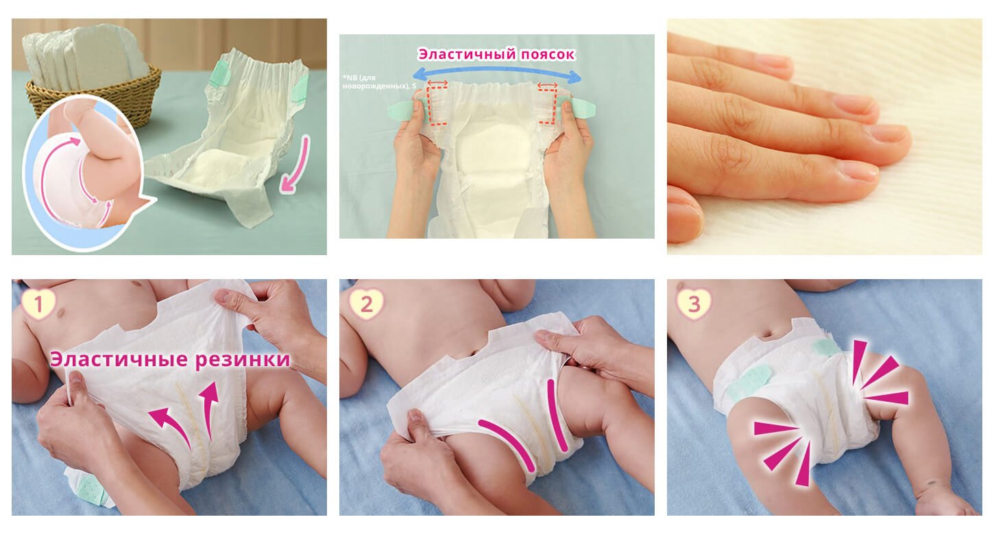 - Анатомическая трехмерная конструкция подгузника плотно прилегает к телу малыша, повторяя его изгибы.