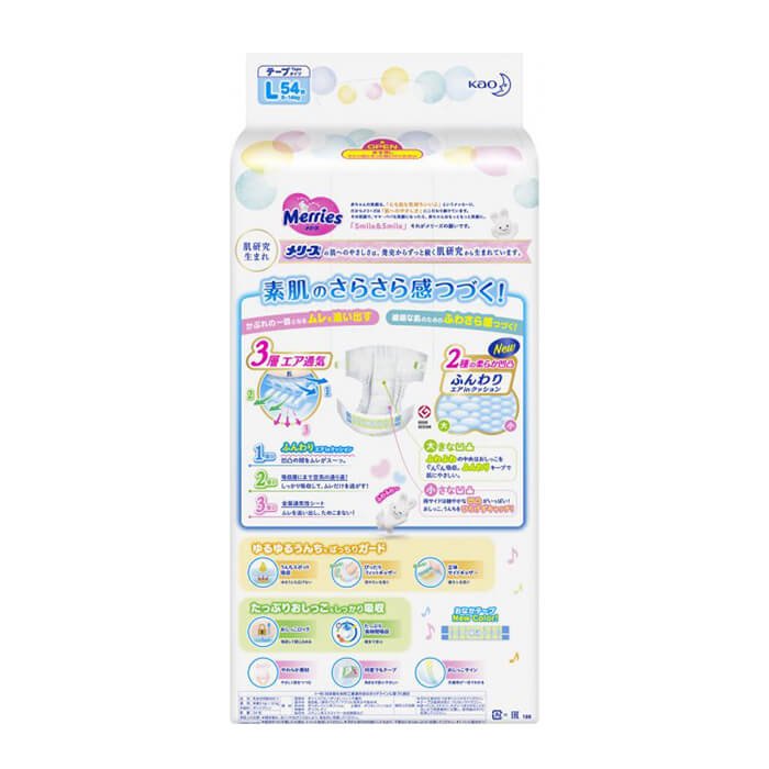 Підгузки Merries L – дихаючі підгузки для малюків вагою від 9-ти до 14-ти кілограм від японського виробника Kao. Відмінною особливістю підгузків Merries є їх здатність виводити вологе повітря з підгузка, що комфортно прилягає до шкіри малюка.
