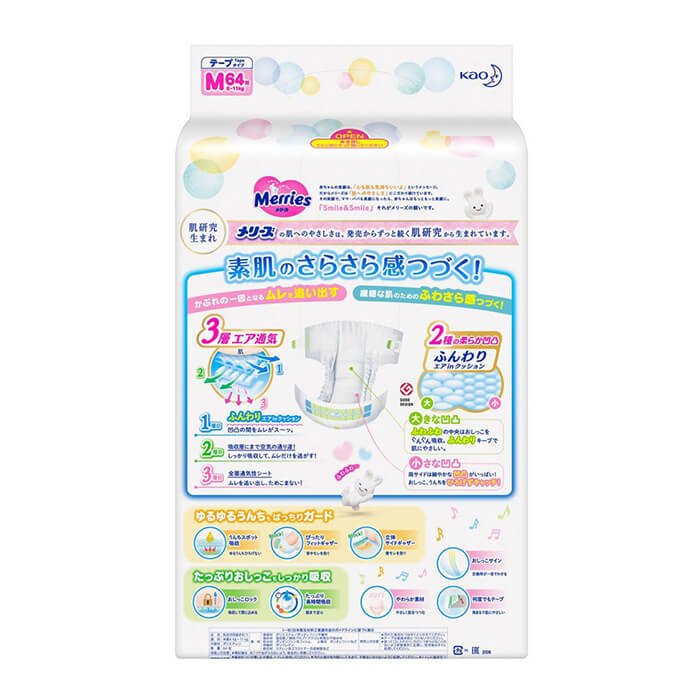 Підгузки Merries М – дихаючі підгузки для малюків вагою від 6-ти до 11-ти кілограм від японського виробника Kao. Відмінною особливістю підгузків Merries є їх здатність виводити вологе повітря з підгузка, що комфортно прилягає до шкіри малюка.