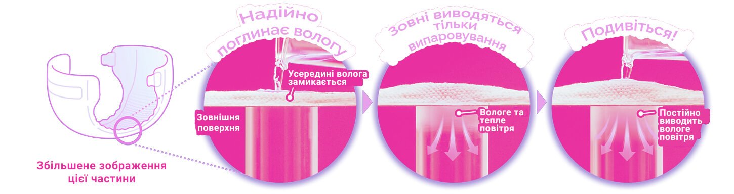 Технологія трьох шарів, що дихають, відмінно виводить преле повітря з підгузника, що дозволяє тілу малюка завжди залишатися сухим: