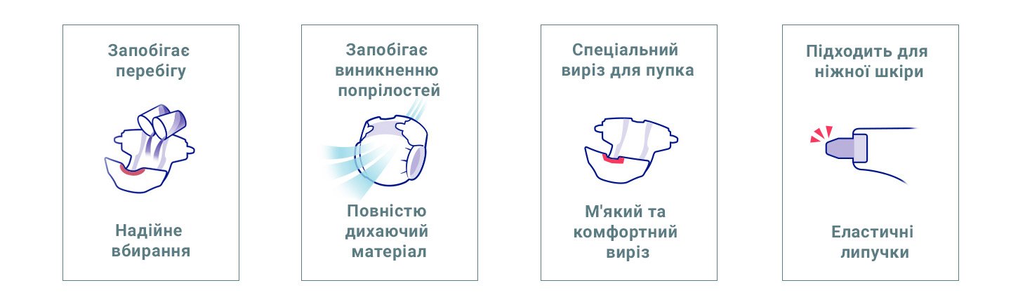 - Анатомічна тривимірна конструкція підгузка щільно прилягає до тіла малюка, повторюючи його вигини
