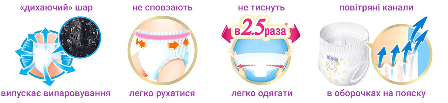 Однією з головних переваг японських трусиків Merries є їхня здатність виводити тепло і вологу, дозволяючи шкірі дихати і залишатися сухою навіть при інтенсивному русі. До того ж, м’які оборочки навколо ніжок не натирають і захищають від протікання, забезпечуючи додатковий рівень комфорту для малюка.