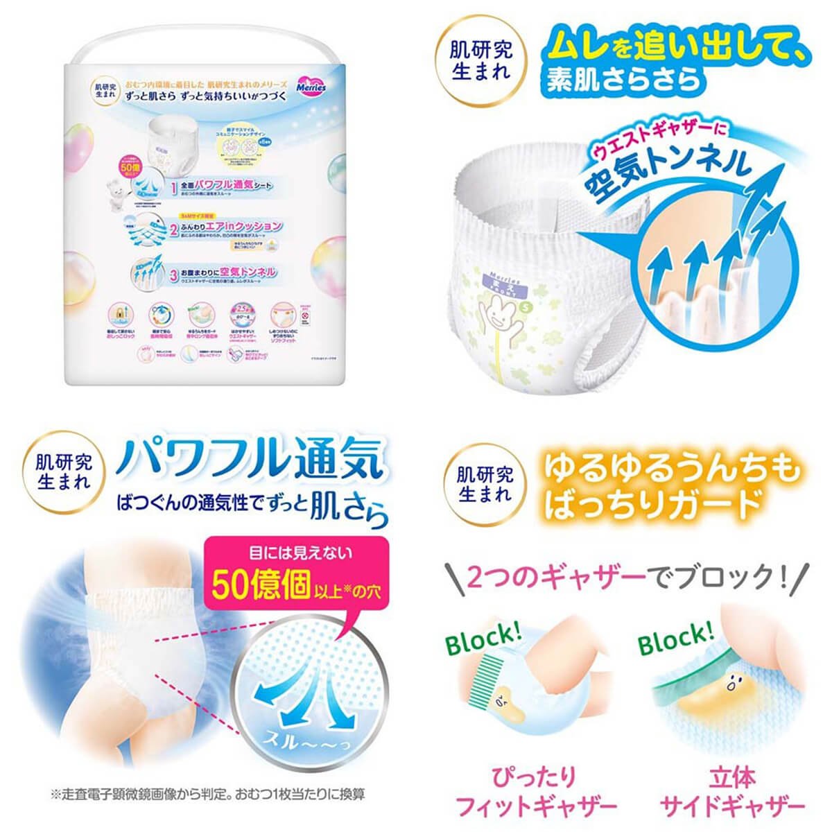 Трусики Merries S – дихаючі підгузки для малюків, вагою від 4-х до 8-и кілограм від японського виробника Kao. Відмінною особливістю підгузків Merries є здатність виводити вологе повітря з підгузника, що комфортно прилягає до шкіри дитини.